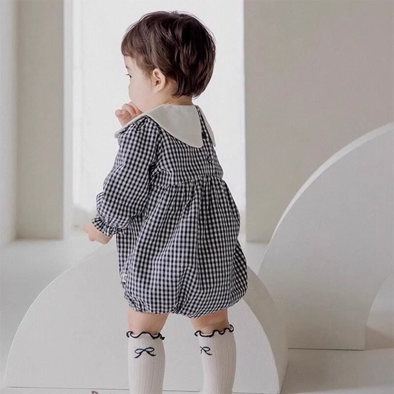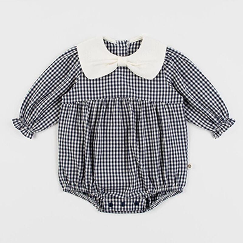 [66-90cm]リボン襟付き チェック柄ロンパース